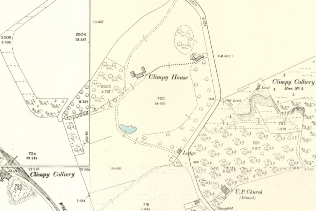 In 1871, following the death of Sir John Kirkland, the Climpy estate was purchased by Glasgow coal-master and iron merchant John Darling (1844-1888), whose family had bought the Cleugh and Forth estates a few years previously. Under new ownership, coal mining was further developed, with a new Climpy pit sunk a little to the west of the house and, for a period, a tramway ran through the grounds to serving Climpy No.4 mine. Records show that the grass parks to the front and rear of the house were let for grazing on an annual basis, and there are references to shepherd’s and gamekeeper’s cottages, however little information exists about the mansion house, which presumably remained unoccupied. The “Laird of Climpy and his youthful and amiable partner” were well regarded locally, but will have spent most of their time at their fashionable home in Glasgow’s Park Circus. John Darling and his guests enjoyed shooting parties on the moors of Climpy and Guildhouse, so it may be possible that the facilities of the house still played a part in such entertainment? John Darling died prematurely at Ampherlaw House; a country home that the family had occupied for a number of years previously. The Climpy estate seems to have passed to his young son, then aged 11, and remained in the family into the early years of the 20th century.