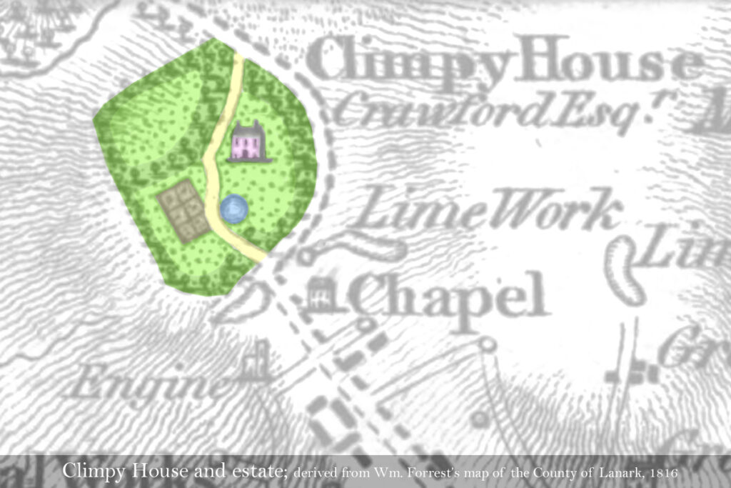 It is thought that the Crawfords built Climpy House in about 1800. The site had been a bleak and lonely moor, and considerable effort must have been required to drain the lands and establish tree belts that provided shelter and privacy. Robert, a Glasgow merchant, had married Mary Wilson in 1792. Mary was daughter of Robert Wilson, the owner of Cleugh estate and senior partner of the Wilsontown iron works, which lay about three miles east of Climpy.