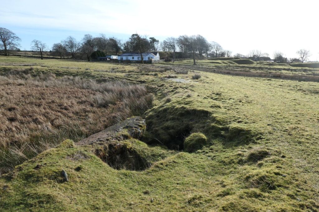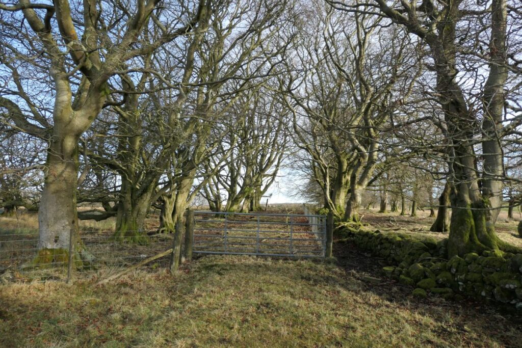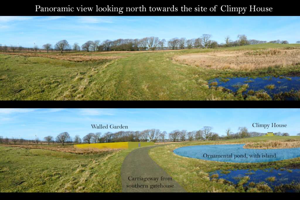 1.) Site of the mansion house, looking east towards the main road 2.) Site of sluice from the ornamental pond, and the carriageway heading south to the cottage built on the site of the gatehouse 3.) Avenue to the north of Climpy House, part of the original planting. 4.) Trenches marking the site of Climpy House, looking south to Tinto Hill