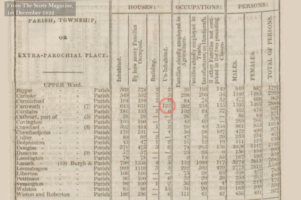Population statistics from 1822 showing the remarkable number of empty properties in Carnwath parish following closure of Wilsontown ironworks, and industry at Climpy.