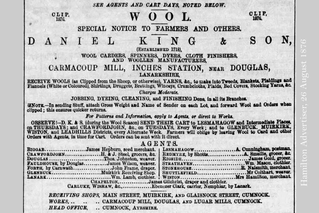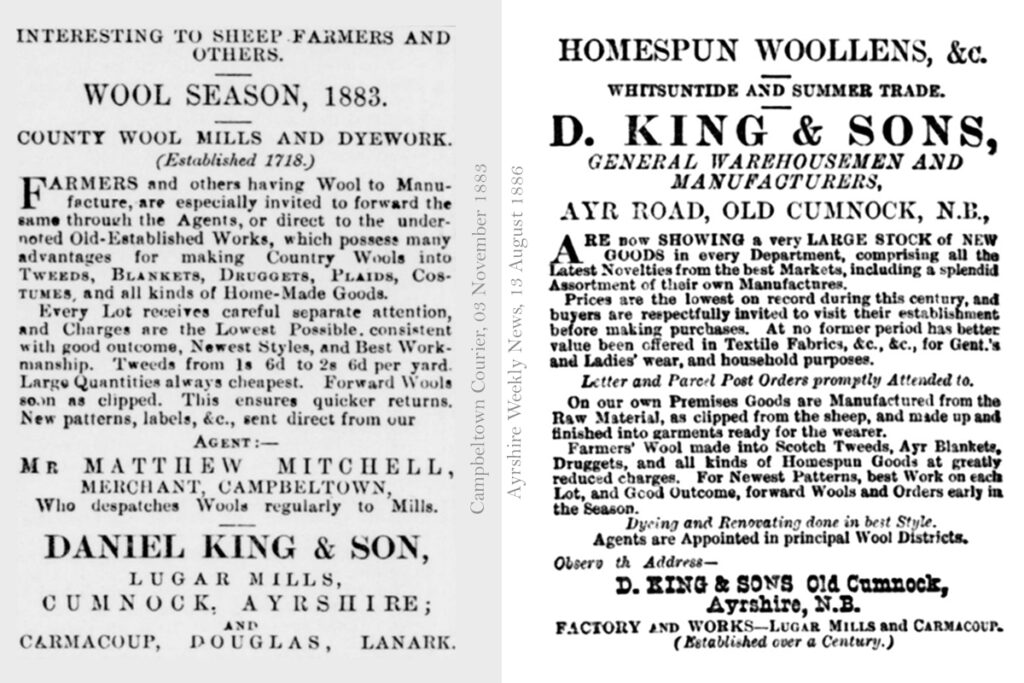 Eighteen or so miles west of Carmacoup mill, in the Ayrshire town of Cumnock, the firm of Daniel King and Sons operated an extensive textile business based at the Lugar woollen mills. By the1860’s these works were equipped to card, spin and dye wool and weave all manner of woollen fabrics. The family firm dated back to 1718, and its core business was as a “country mill” in which raw fleece was collected from farmers and returned back to them as finished goods such as blankets and tweed cloth. Farming families often make their own clothing from such country tweeds. This service was paid for either in cash or in wool. During the annual “clip”, D. King & Co. sent vans to collect wool from local villages, and appointed a network of agents across the West of Scotland (from Stranraer to Campbelton) to which farmers delivered their raw fleeces.