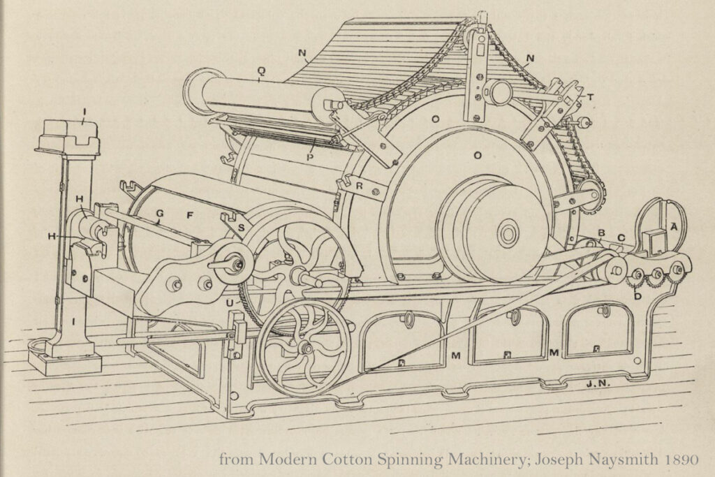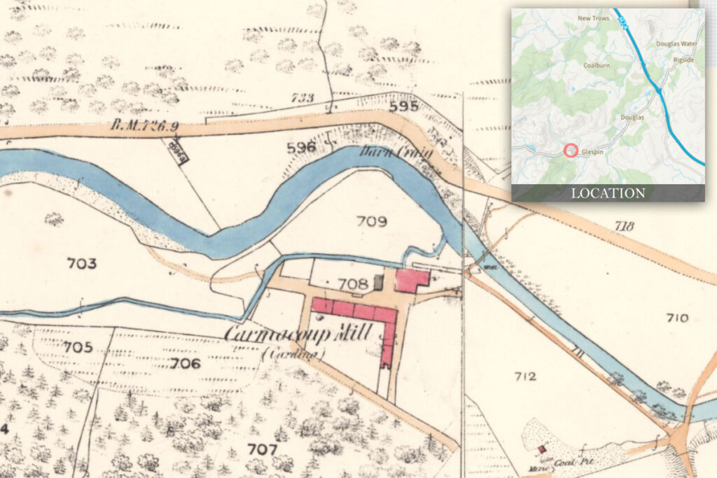 At one time, most of those living in Douglas parish were involved in the spinning and weaving of wool. It was said that “in farm houses the men, on long winter nights, carded the wool and the females spun”. Textiles remained a cottage industry until about 1793 when a small-scale (and ultimately unsuccessful) cotton mill was built in Douglas. The Old Statistical Account recorded that at about the same time “another reputable company, mostly belonging to this place, have erected a small carding and spinning mill on the lands of Carmacoup”.