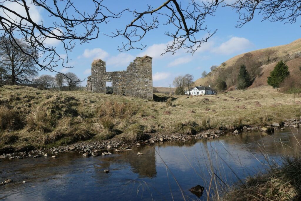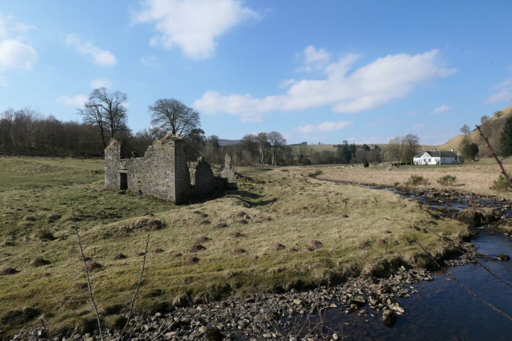 The valley of the Douglas Water narrows after passing through Glespin; and the road west clings to the hillside as it winds towards the county boundary and onward to Muirkirk, Cumnock and Ayr. When navigating the bends of the A70 near Carmacoup, you may glimpse a tumbledown stone building picturesquely sited beside the burn. The landscape in this area still bears the traces of coal mining, however the ruin is a reminder of a much earlier industry, and a traditional form of trade.