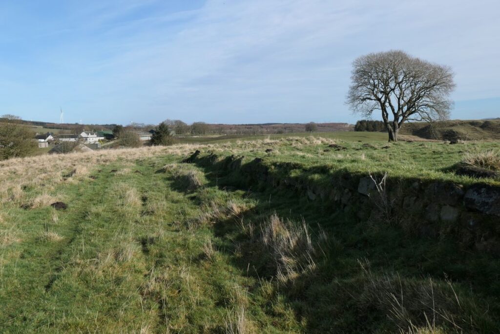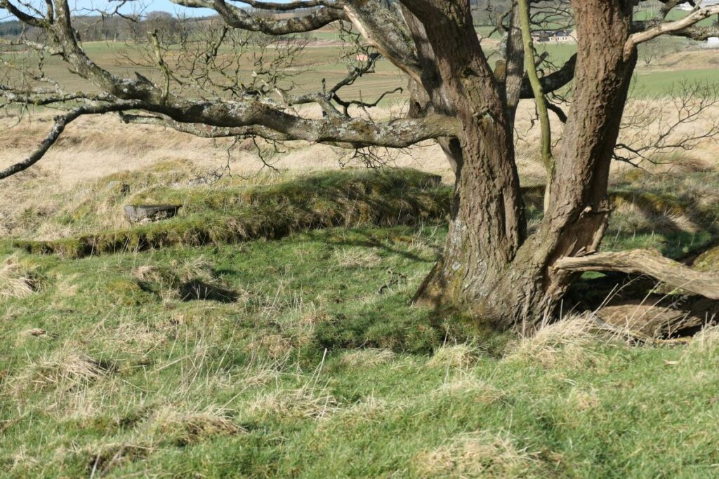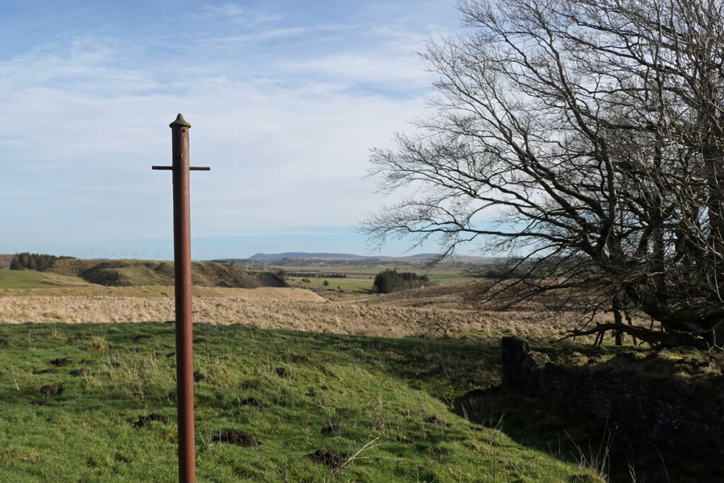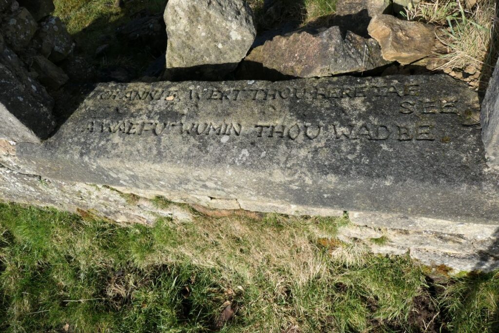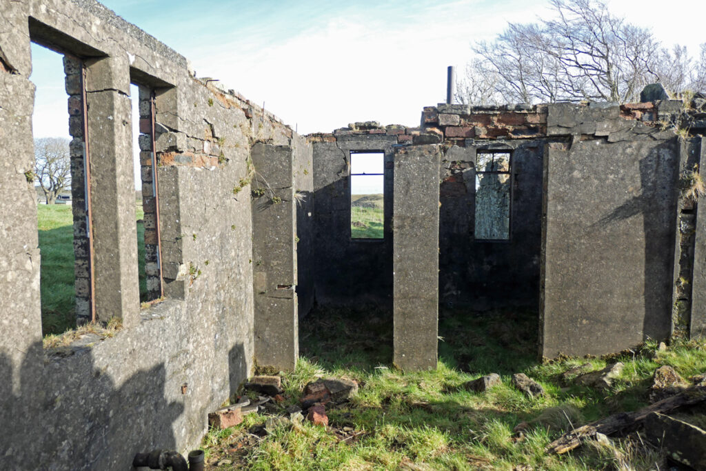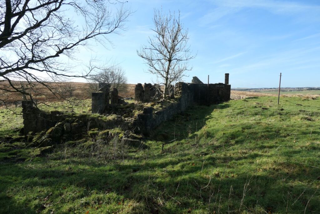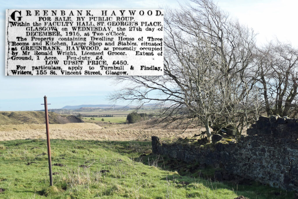 The ruined grocery store at Greenbank overlooks a wild expanse of featureless moorland. You reach it along a grassy track that winds up a slope past a series of ridges and terraces overgrown with tussocks of rough grass. This is Haywood, Clydesdale’s largest ghost village, once home to over a thousand people, and now a scheduled monument. Haywood was laid out in a network of streets and squares with its own church, post office, police station, public hall, and a number of shops. It even had its own railway station. Today the roofless ruin at Greenbank is almost all that remains of a once sizeable settlement and a proud community