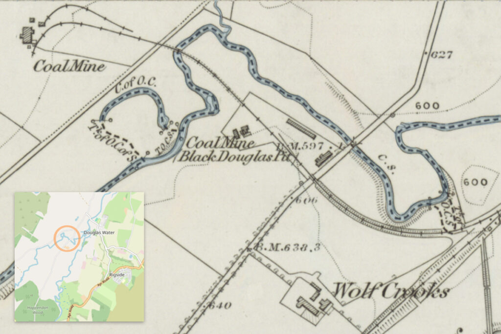 From the few records that are available, it seems that the Rigside cannel was worked from pits on the north side of the Douglas Water, (which included the lands of Tower farm), and perhaps the “Black Douglas pit” marked on the first edition OS map was the 10 fathom pit previously referred to. This will have been sunk in the early 1860’s,at around the time the Caledonian Railway’s Douglas branch was built. A siding extended along a low curving embankment across the floodplain below Wolf Crooks farm then crossed the public road to Black Douglas pit. The line continued northwards, crossing the road to Coalburn to serve a further pit.