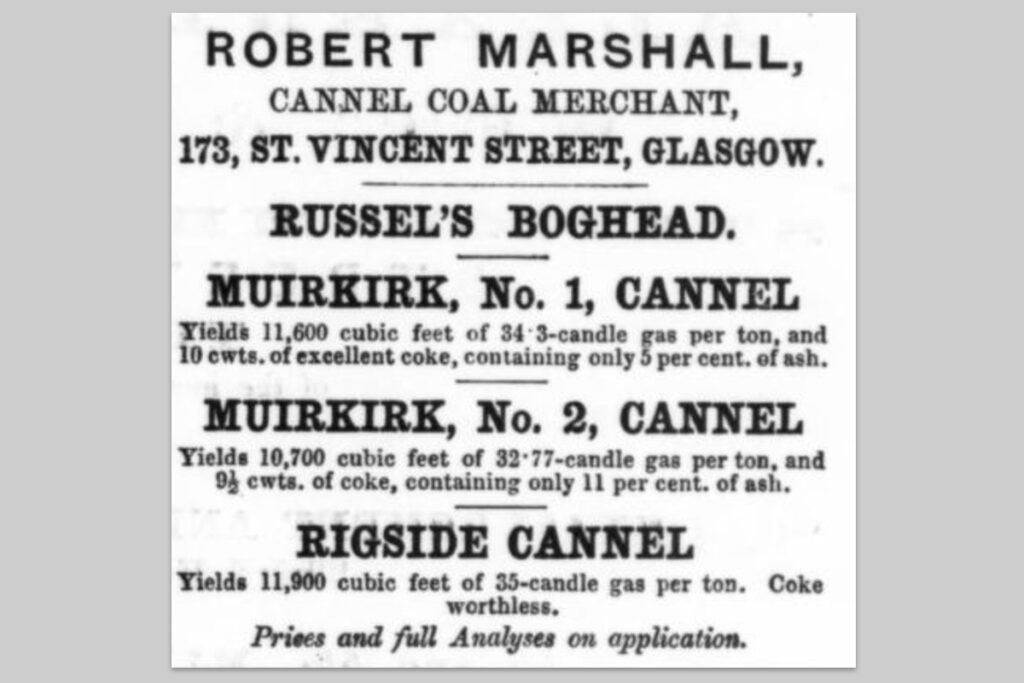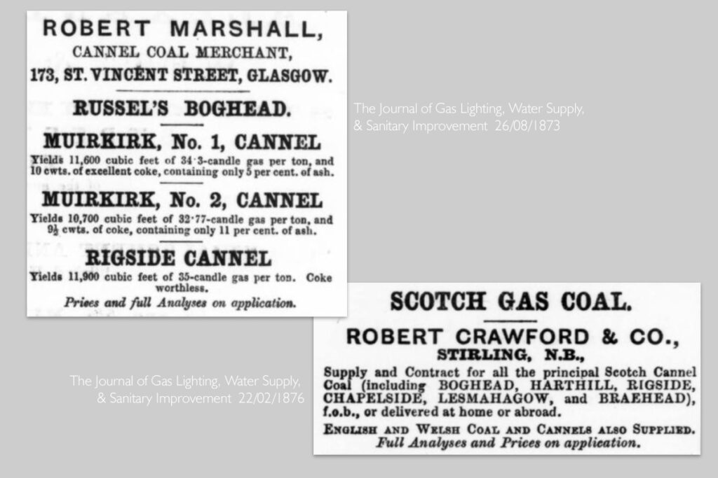 “Scotch Cannel” was highly regarded in the gas industry, and the Lesmahago (usually spelled without the “w”) was one of the richest, most consistent, and best known types of cannel, second only to the renowned Boghead Coal that was found near Bathgate. Lesmahago Cannel was often quoted as a standard against which the merits of other gas coals were judged.