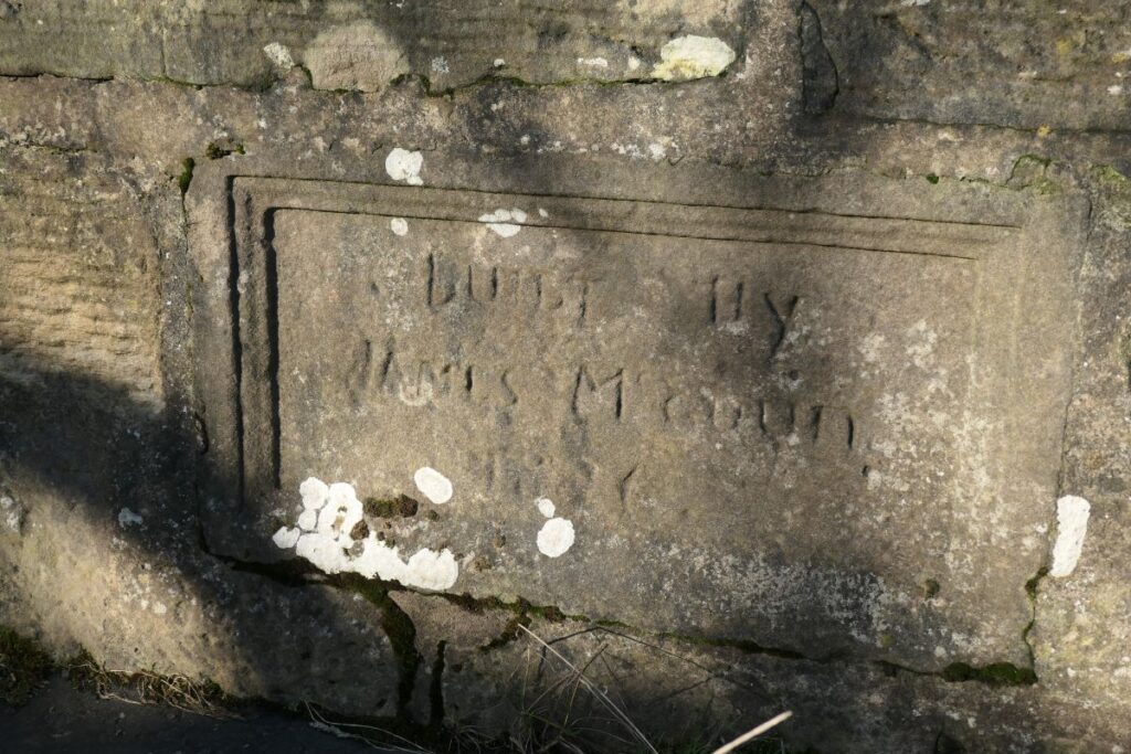 The curved embankment, looking towards the Caledonian Railway, Wolf Crookes Bridge, looking towards site of Black Douglas pit, and plaque on the bridge.