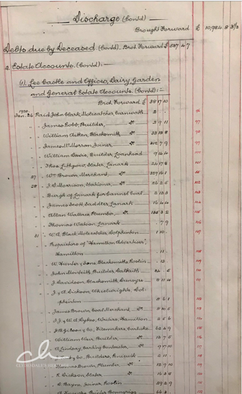 As part of the work in of administering the estate on Sir Simon’s death, the following document below was produced as part of the accounts, and is of great interest as many of the individuals and businesses mentioned in it will be familiar to Lanarkians
