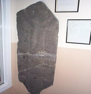 The book, McCallum’s Clydesdale, was written in 1924. It is a mine of useful information and a special chapter is devoted to Carstairs. In his book McCallum describes how he found several gravestones in the vestry which had been found by the grave diggers. One of these has on it a crucifixion scene. The Reformers destroyed virtually every item displaying the crucified Christ as they considered that a Papist abomination. However, the vestry area is impressive, being converted into a little museum. On display was a Mediaeval Skillet. It was labelled a Roman Camp Kettle.