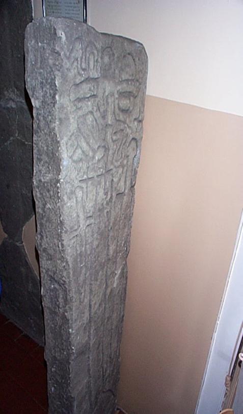 The slab with the crucifixion scene on the first page is 15th century in date and quite what its purpose is difficult to say. It is very unusual to have crucifixion scenes on grave stones but I have seen several examples as Monumental Brasses and these date back to the 14th century. However going by the style of lettering—a date of the fifteenth century would seem to be more appropriate. My conclusion is that it is the grave slab of a local cleric and may have been made locally. Like the slab above the quality of workmanship is not there  and I would be surprised if it was somebody notable as there were craftsmen capable of producing really good quality workmanship at that period within Scotland.