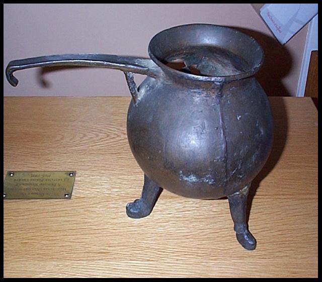 What of the skillet? It is typical of the 14th century and was found in the late 19th century at Columbie farm. Unfortunately, it is slightly damaged as somebody put their pickaxe through it when it was discovered.