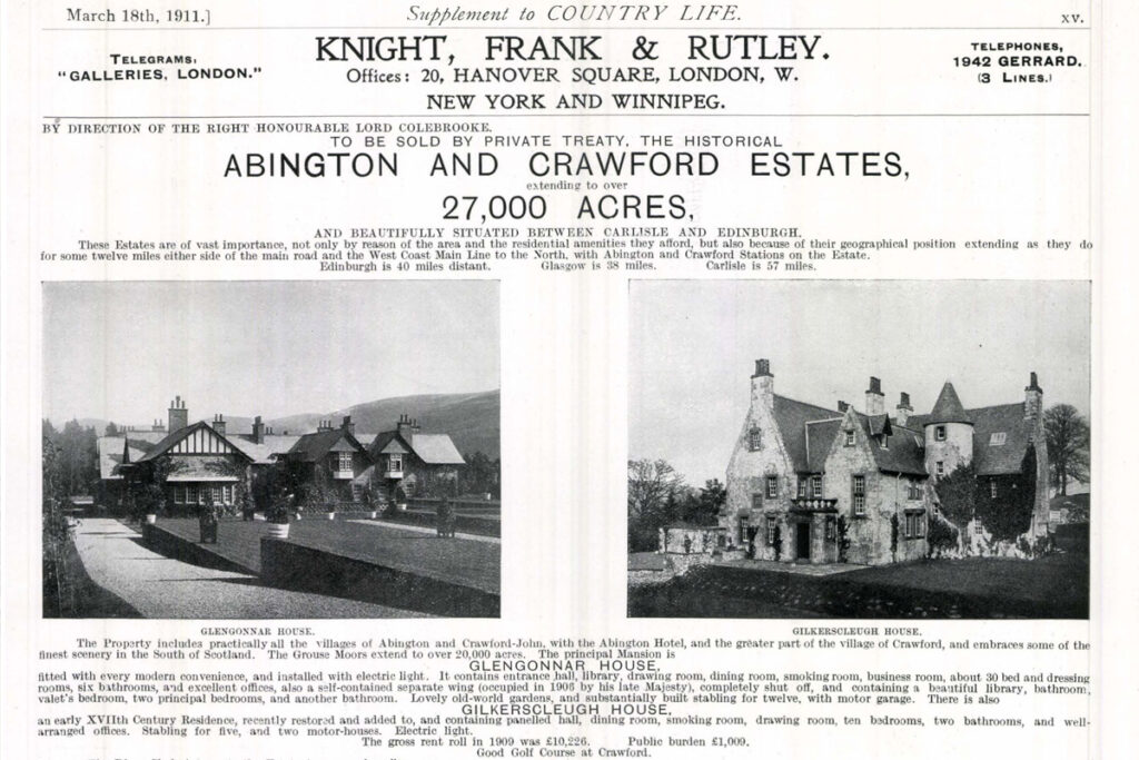 Lord Colebrooke’s trustees put the Abington estate on the market again in 1921, and sought to rent out Glengonnar for the shooting season, or for longer periods. The Countess of Stafford, presumably while renting Glengonnar, held a garden party for local WRI in the “heather house” during 1920, perhaps marking a last hurrah for Glengonnar. Various contents were sold in 1923 and by the mid 30’s, both Glengonnar House and the workshop were listed as empty in valuation roles.