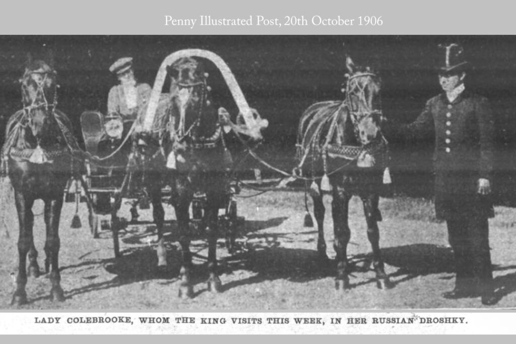 King Edward VII spent four nights at Glengonnar in October 1906 and arrangements for this grand visit were probably already being planned in February of that year when the King conferred a peerage on Sir Edward. The now Lord and Lady Colebrooke were lavish hosts, and despite winter weather the Royal visit proved a great success.