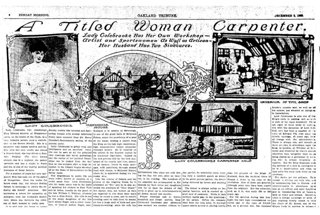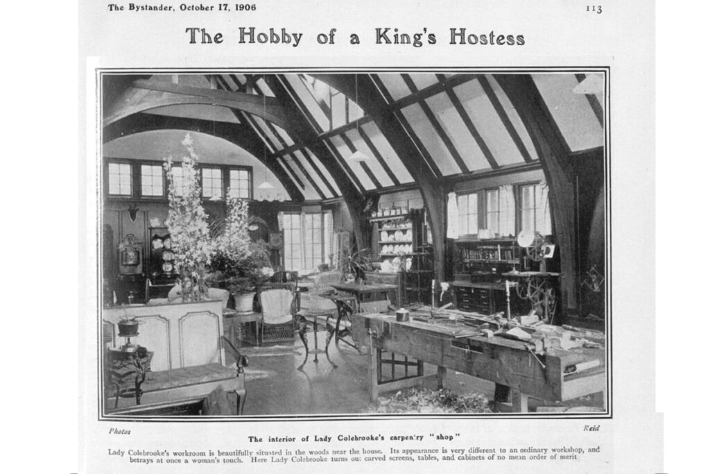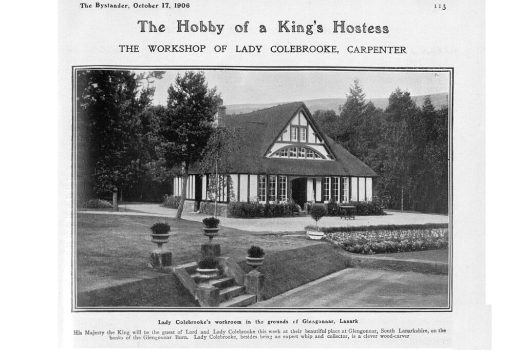 Lady Colebrooke’s Workshop was perhaps the most notable feature of Glengonnar House. Set beyond the lawns, some distance to the house, it was a fanciful construction said to represent an old English farmhouse but – rather incongruously – thatched in heather. The oak frame was exposed within the lofty interior which accommodated both woodworking machinery and all the appurtenances required for a dainty tea party. Photographs show an electric-driven bandsaw and table saw; equipment for steaming timber, and various tool racks and work benches, all set between floral arrangements, potted palms, and comfortable soft furnishings. During autumn months, Lady Colebrooke would build furniture in her workshop while Sir Edward was on the grouse moor, and she sometimes ran carpentry and craft classes for the women and girls of the estate, continuing a Colebrooke tradition. The workshop or “heather house” was also a boon when it came to entertaining, and during grand garden parties a tented passage could be set up across the lawn to link the workshop with the house.