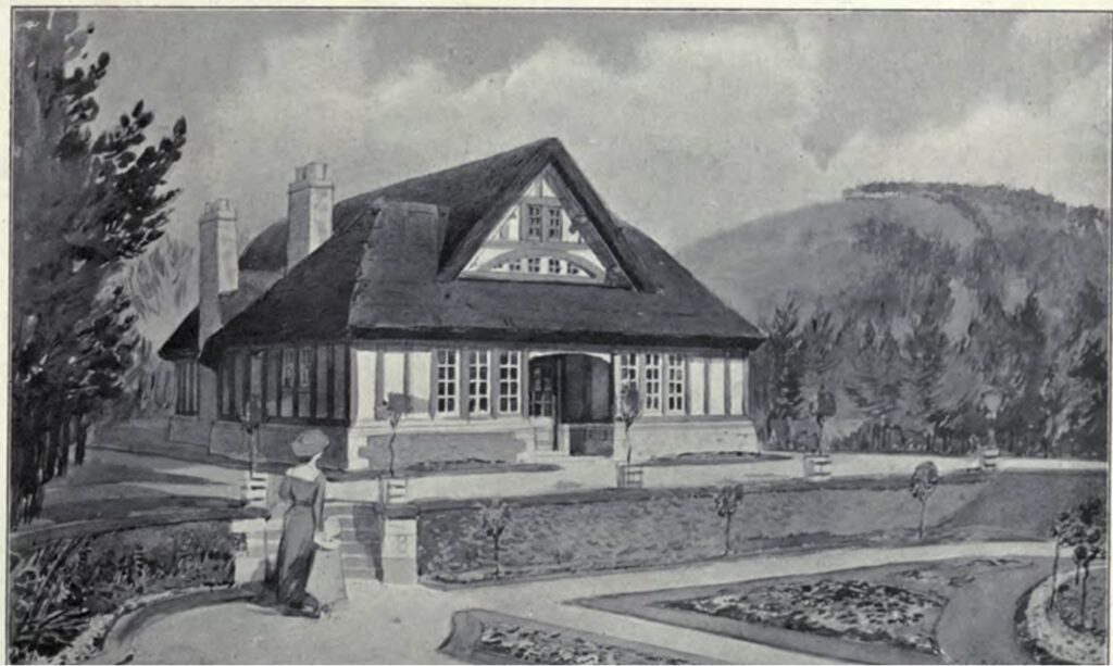 The rambling design of the mansion incorporated architectural elements and finishes that were greatly fashionable at the time, but perhaps the overall arrangement lacked the simplicity and balance of the finest houses built in the arts and crafts style. The house won no awards. The irregular shape and roofline of the building gave the impression of a house that had been added to over an extended time. It seems to have been completed in phases. The Colebrookes were entertaining at “Glengonnar Lodge” by 1902, and further building works seems to have been completed by about 1904. A final wing was completed in advance of the King’s visit in 1906, providing accomodation for the Royal household that was completely independent of the rest of the house. The decoration of the interior of the house featured much carved woodwork, doubtless reflecting Lady Colebrooke’s taste; and perhaps her own handiwork. The house, nestled within the picturesque wooded glen, was set within extensive lawns, terraces, gardens and shrubberies.
