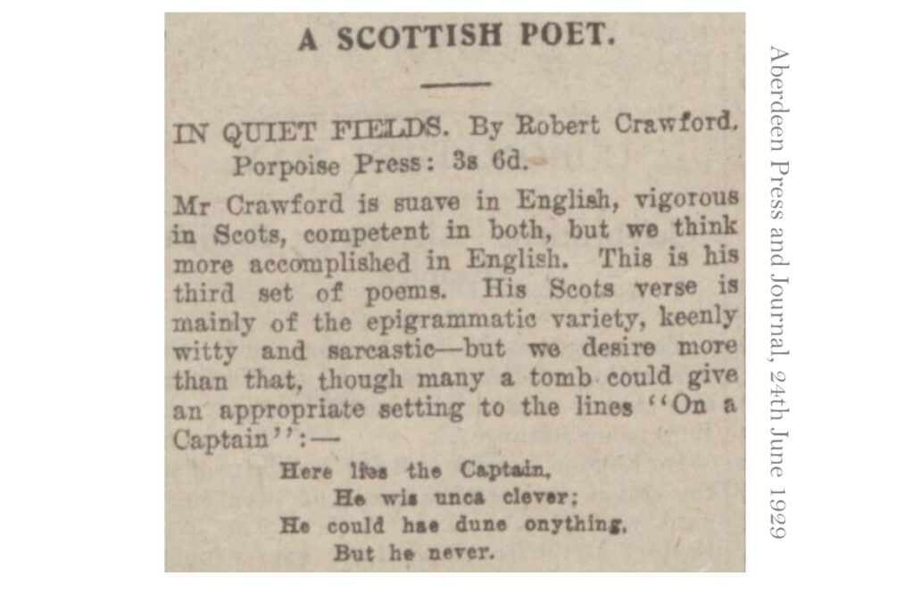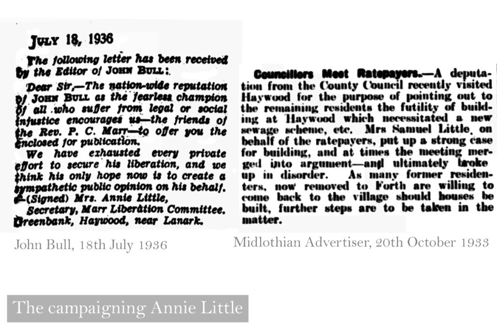 1.) Some campaigns of Annie Little, to release a local minister from an institution, and to have new council housing built at Haywood rather than Forth. 2.) Robert Crawford’s book of poetry; (you’ve got to love the epitaph.) 3.) George Donaldson’s poem includes tales of drunken times outside the Greenbank store.