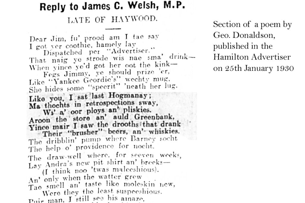 The questions of whodunit? and why? remain. The coothie witticisms of the inscriptions bring to mind the poetry of collier-poet Robert Crawford, who went to school in the village of Haywood but died in 1931. Of course many burst into the Scots vernacular to express witty, thoughtful or political ideas, and Clydesdale was well known for its amateur poets. These included George “Dod” Donaldson, who had various witty rhymes published in local newspapers, often relating to his home village of Haywood and (in at least one work), to the store at Greenbank. He also authored a book on “Reminiscences of Haywood”. When he died in 1949, it was said that “the village has lost a kenspeckle, lovable figure, hard working in its social interests and activities.”
