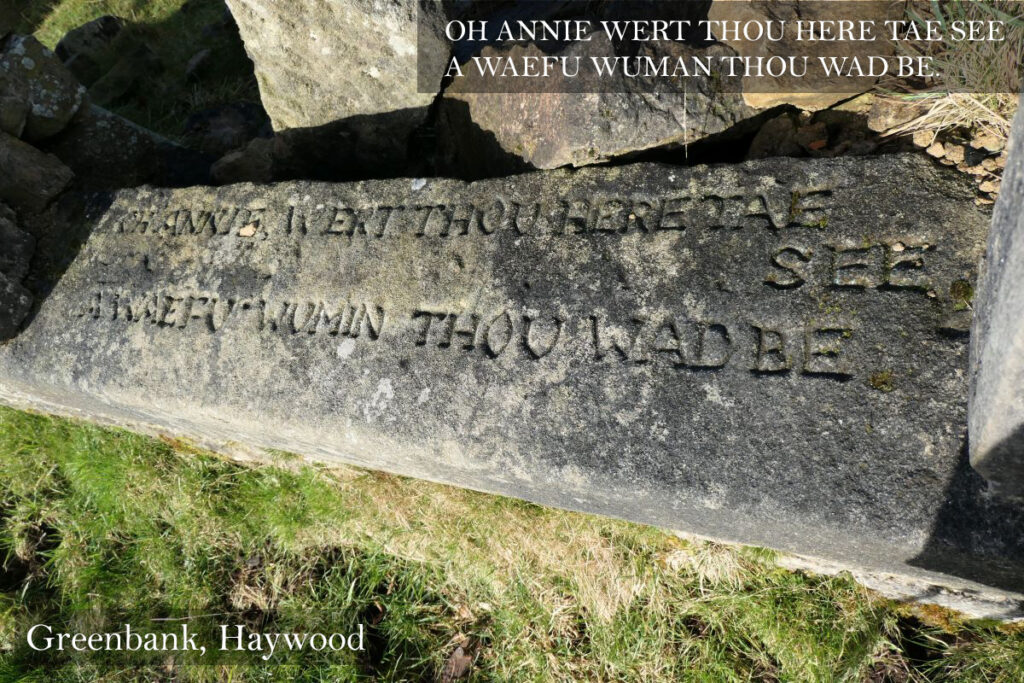 On a window sill just three miles away in the ghost village of Haywood, there is a similar style of inscription. In similarly inscribed capital letters, one of the sills of the ruined licenced grocer at Greenbank exclaims “Oh Annie, wert thou here tae see, a waefu woman thou wad be”. It seems that the subject of the inscription was Annie Little (1889- 1956) who was proprietor and licensee of Greenbank store, and campaigned for the people of Haywood during the last days of the village. Annie remained at Greenbank into the 1940’s, and the store continued trading within the derelict village for several more years. It seems therefore that the inscription would have been carved no earlier than the 1950’s when Greenbank was falling into a woeful state of decay.