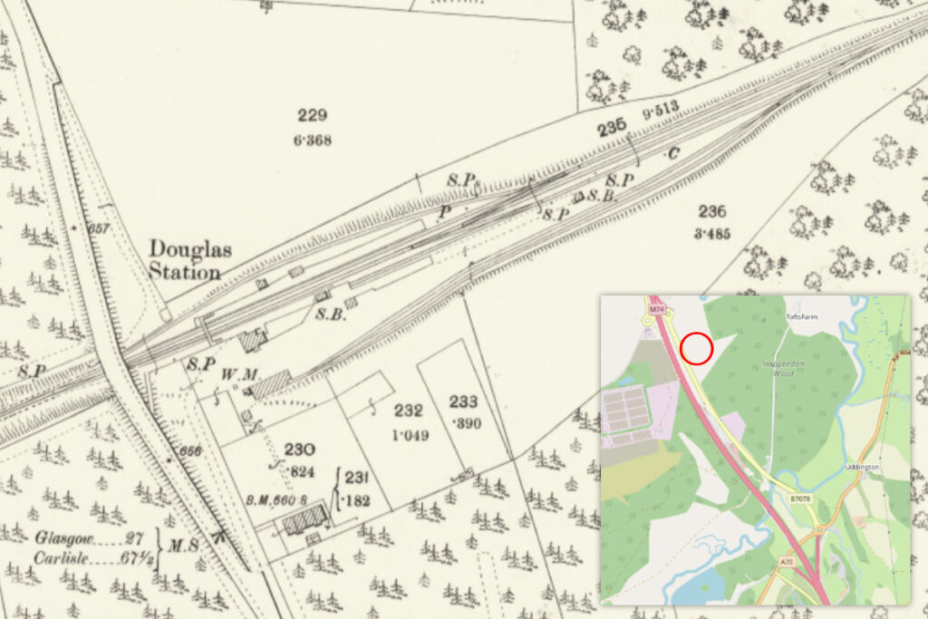 The Caledonian Railway’s Douglas Branch opened to passengers in 1864, slicing through Hippandon Wood (now spelled Happendon) to curiously terminate at a little-populated location almost three miles distant from the village of Douglas. Within ten years the line was extended to Muirkirk (and onward into Ayrshire) following a route that carefully avoided the grounds of Douglas Castle; and much to the inconvenience of the villagers.