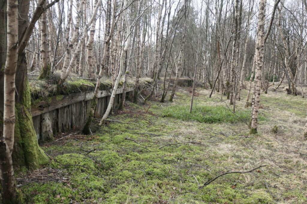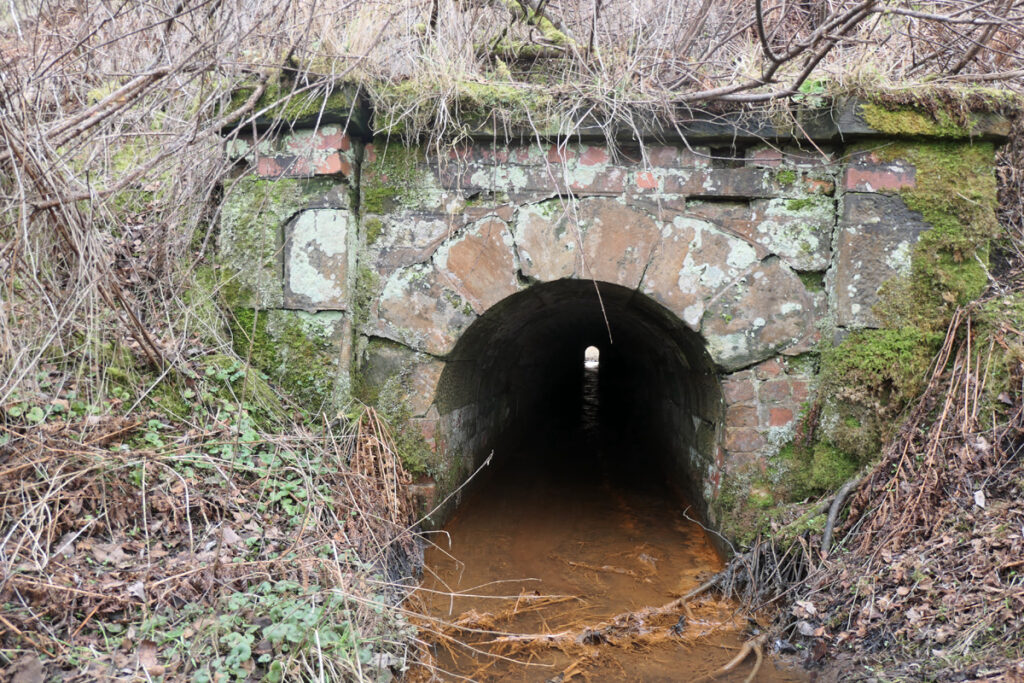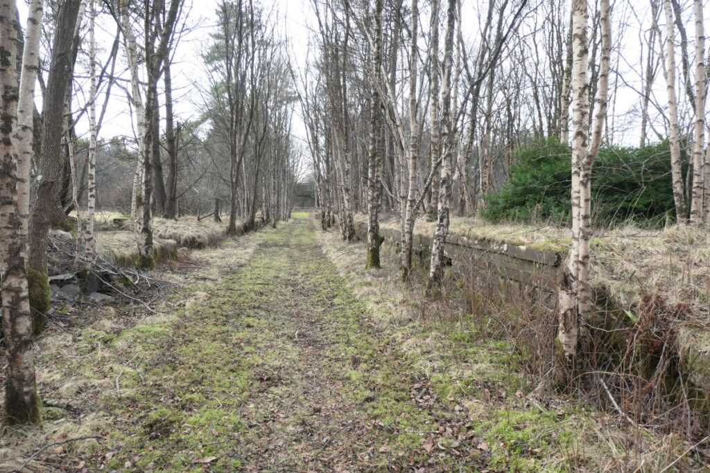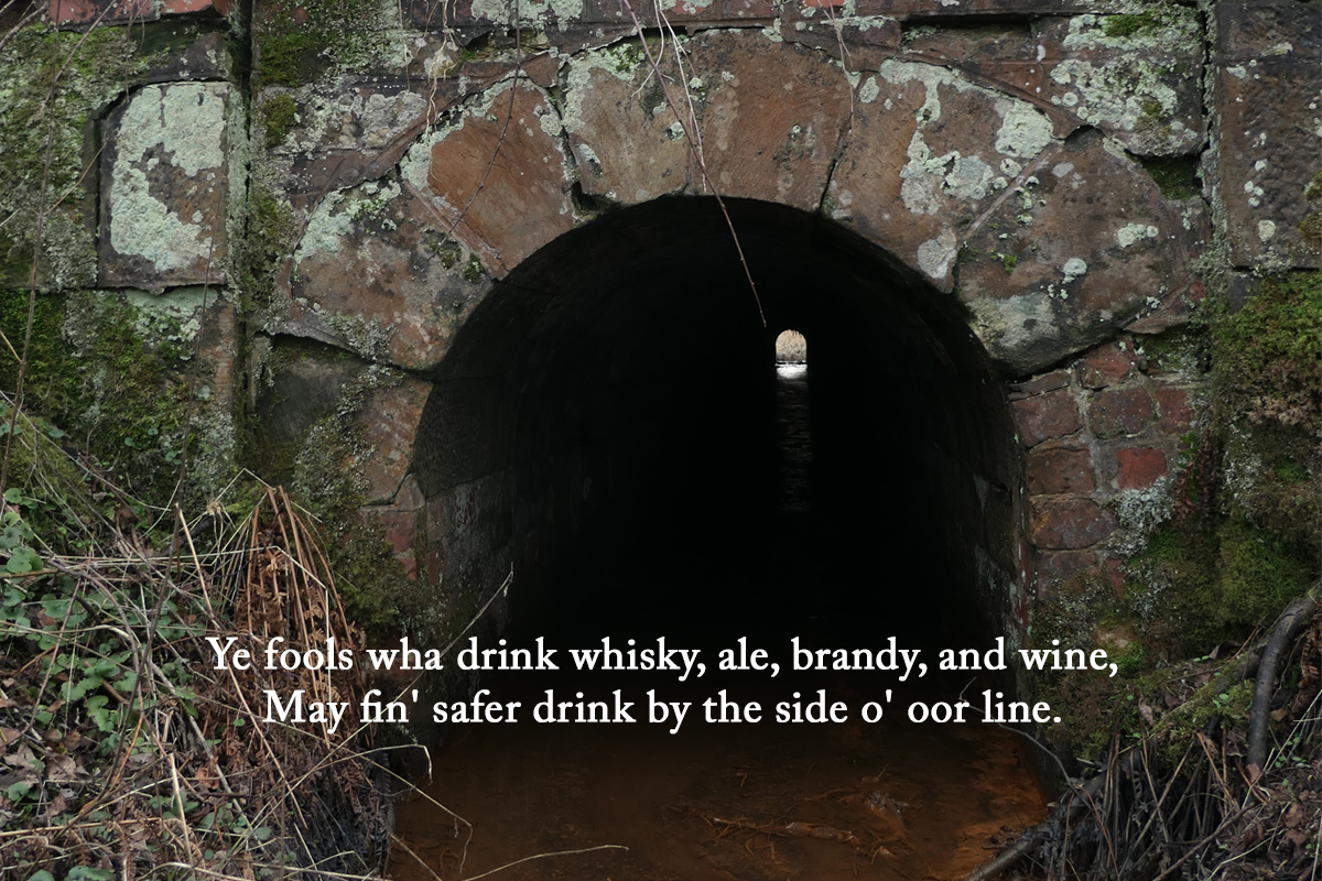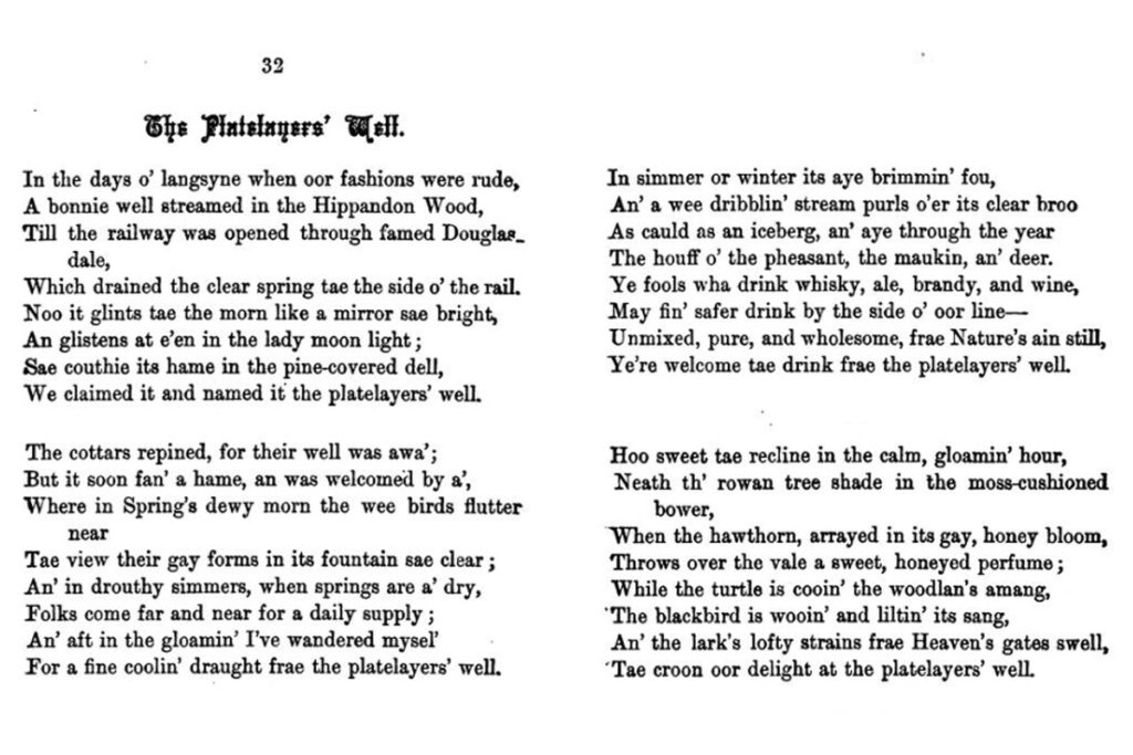 There are few clues to the precise location of the “well” within the wood or at the lineside, and to what extent artistic licence has been exercised in the poem. Water from Happendon Wood now drains into a small burn that passes through a long culvert beneath the embankment on which the station once stood. The exit of this culvert seems a likely candidate as the Platelayers’ well, however the iron-stained stream seems more like a irn-bru than wholesome water; perhaps because much of the wood has been harvested for timber in recent years.