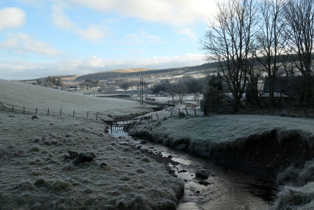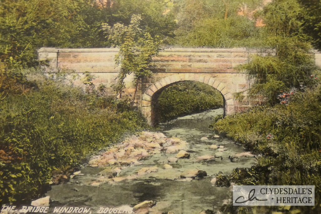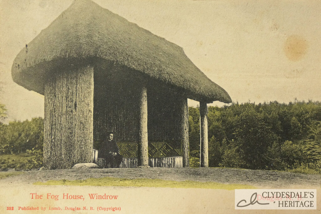 In Windrow Wood, a well-known fog house commanded an impressive view across the deep wooded glen of the Windrow Burn towards the village of Douglas and to Douglas Castle about two miles to the north east. The fog-house was described in 1876 as “a spot of surpassing loveliness and which has been a favourite place of resort for the fair ladies of Douglas for many generations” In 1891, another correspondent reminisced how in childhood “we sat in the fog house and surveyed the links of Douglas Water, opening up into our view of the Douglas Castle policies with their beautiful lakes with their far-famed castle gardens.“