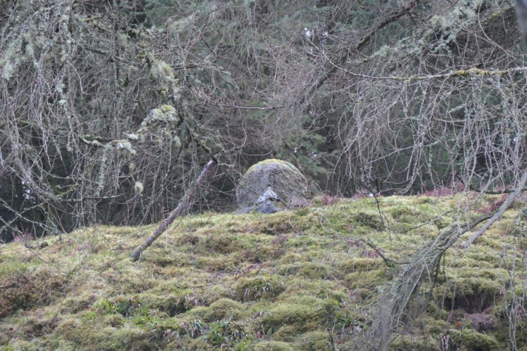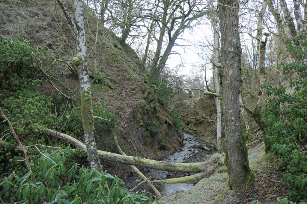 Much was done to extend the amenity and productivity of the Douglas estate during the second half of the 19th century. An elegant lodge house – Windrow Cottage – was built to guard the entrance to the glen and woods, and provide a home for the gamekeeper. In 1880 (according to J.D. Hutchison) the estate employed many of Douglas’ unemployed weavers to build a carriageway within Windrow Glen. This was an impressive piece of engineering which included a neat stone bridge over the burn, and a turning loop carved into the sides of the valley. One might imagine the distant sunny days when horse drawn carriages would convey fine ladies and gentlemen deep into the glen. They might alight near the mineral spring and continue along a short footpath beside the rhododendrons to get a better view of the Fog House perched high above them at the top of the steep walls of the glen.
