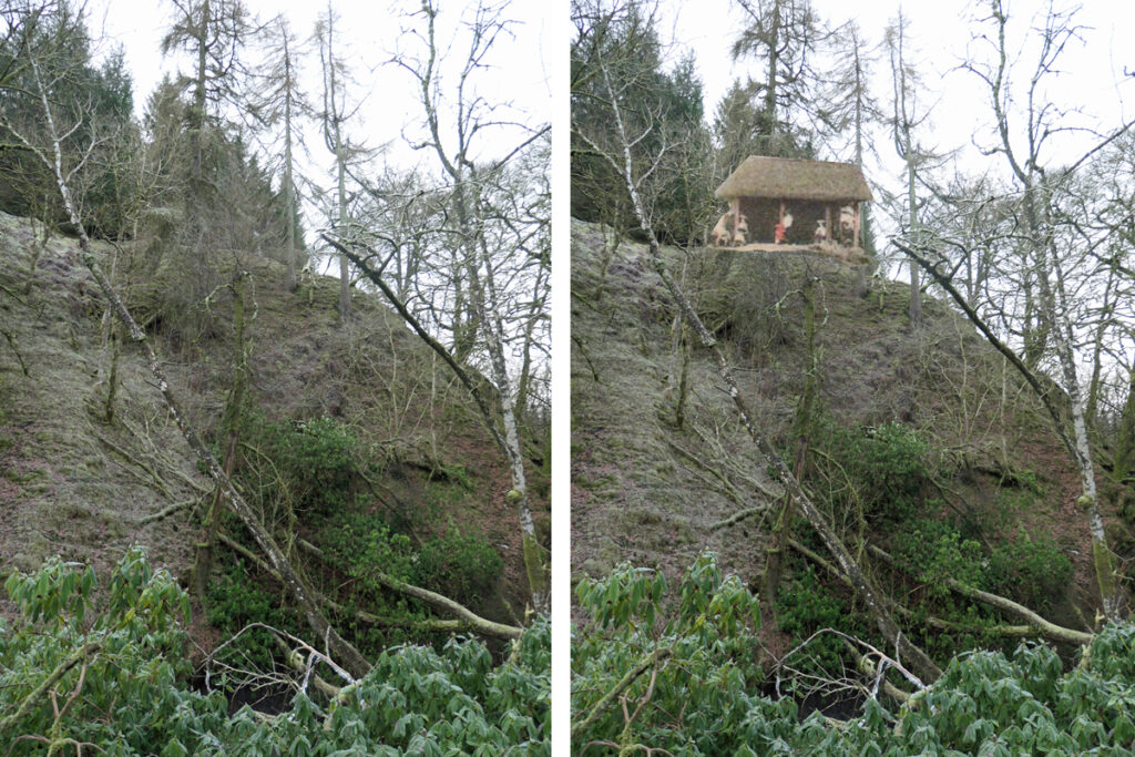 Windrow wood was a long-established plantation that provided shelter to the planned landscape of the Douglas estate. The 1850’s OS maps shows a network of paths through the trees and a small building perched perilously close to a precipitous slope of down to the burn. This was presumably the fog-house, which early postcards picture as rather a lofty structure with a tall thatched roof, which was large enough to squeeze in a dozen of more people. With the landowner’s consent, Windrow Wood was a popular destination for excursionist. One account of a school outing in August 1880 described how “the grateful shade of the wood was much welcomed and, notwithstanding the broiling sun overhead, the party were enabled to do the “Fog House”, “The Woman’s Grave” and the gardens lately made there, with comparative ease”.